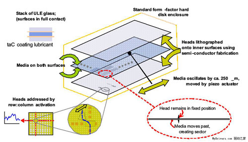 Hiện tại số đầu đọc ghi trên lớp đĩa mới chỉ có 64 chiếc, phải chuyển động đĩa ngang dọc phù hợp với vị trí của đầu đọc ghi để tiến hành đọc ghi, nhưng về mặt lý thuyết có thể gắn thêm vài triệu đầu đọc ghi, từ đó tạo ra một bề mặt đọc ghi với quy mô lớn, như vậy mỗi một đầu đọc ghi có thể tiến hành xử lý đọc ghi ghi số liệu trong từng vị trí này, và như vậy chúng ta sẽ không phải mất thời gian chờ đợi khi muốn tìm kiếm dữ liệu, đương nhiên tốc độ cũng sẽ đem lại sự khác biệt rất lớn, hơn nữa tốc độ đọc ghi sẽ tương đương nhau và nó sẽ có tốc độ ghi nhanh hơn ổ HDD và SSD.