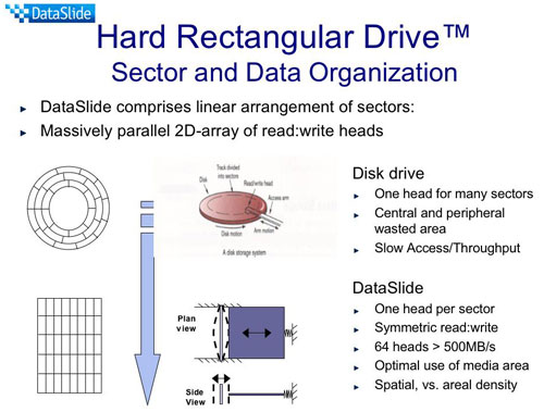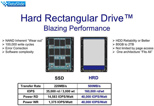 DataSlide cho biết, dung lượng của loại ổ HRD này có thể từ 80GB lên đến 2TB, tốc độ chuyển dữ liệu có thể đạt 500MB/s và tính năng đọc ghi 160.000 IOPS, tiêu thụ điện năng không đến 4W, thấp hơn so với ổ HDD và SSD. Đồng thời độ tin cậy của loại ổ cứng này cũng cao hơn HDD và SSD, không tồn tại những vấn đề như mài mòn chíp nhớ NAND và khả năng tính tương thích với phần mềm.
