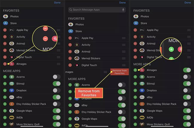 Nhấn vào nút - bên cạnh Images. Chọn Remove from Favorites. Images sẽ chuyển xuống phần More Apps. Từ đó, chạm vào nút + để bật lại.