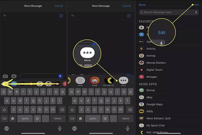 Bạn có thể khôi phục chức năng Images bằng cách tạm thời xóa và sau đó kích hoạt lại nó. Để làm như vậy, cuộn sang bên phải thanh ứng dụng trong Messages và nhấn nút More. Chọn Edit ở góc trên bên phải.