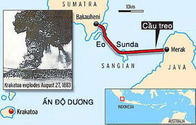 Vị trí cây cầu Java-Sumatra trong tương lai và ngọn núi lửa Karakatoa. (Ảnh. SMH)