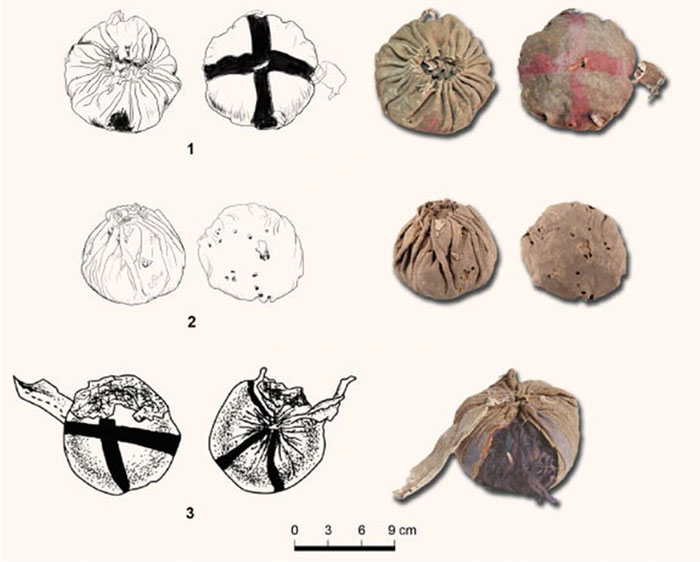 Những quả cầu da kỳ lạ mà các nhà khảo cổ đã tìm thấy trong 3 ngôi mộ cổ. (Ảnh: ABC).
