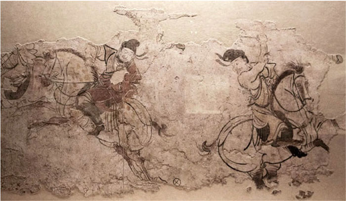 Một bức tranh tường mô tả trò chơi cưỡi ngựa đánh bóng được tìm thấy trong mộ cổ ở Thiểm Tây. (Ảnh: Sohu).