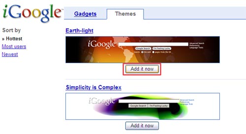 Giờ, bạn nhấp chuột vào liên kết Select theme, pop-up hiện ra, chọn cho iGoogle một giao diện mà bạn thích. Cuối cùng nhấn Add it now đối với theme bạn đã chọn.