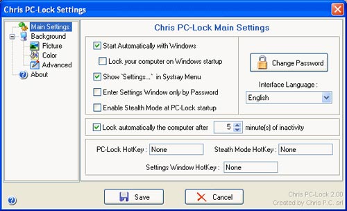 Giao diện "Setttings" của Chris PC-Lock