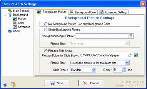 - Muốn dùng album ảnh số của bạn để thay thế cho các hình phong cảnh sẵn có của Chris PC-Lock thì bạn chép toàn bộ các ảnh số cần dùng vào thư mục “Background” nằm trong thư mục cài đặt Chris PC-Lock -> sau đó chọn “Picture” trong “Settings” -> đánh dấu vào “Pictures Slide Show” và nhấn “Save” để hoàn tất. Khi kích hoạt là Chris PC-Lock sẽ trình diễn album ảnh số theo dạng slide show rất hấp dẫn.