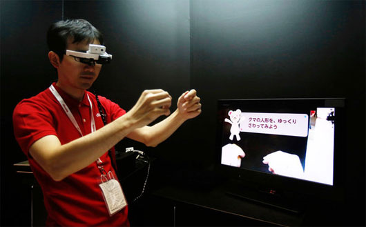 Một nhân viên của NTT biểu diễn việc sử dụng chiếc kính dịch. (Ảnh: Reuters)