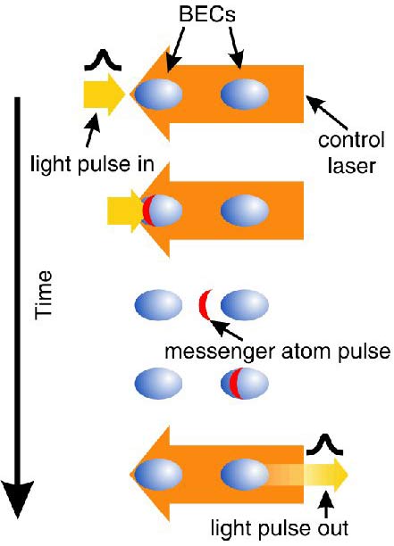 Một điểm sáng tạo là nhóm ở Harvard đã quyết định đợi cho đến khi nguyên tử kích thích spin đi đến vị trí ngưng tụ thứ hai trước khi tác dụng lại các laser điều khiển. Và họ nhận ra rằng tập hợp các nguyên tử tách biệt một cách vật lý này sau đó có thể phát xạ lại ánh sáng ban đầu. Xung ánh sáng được khôi phục này lan truyền một cách chậm rãi khỏi vị trí BEC thứ hai trước khi đạt vận tốc 300000 km/s như vốn có của ánh sáng.