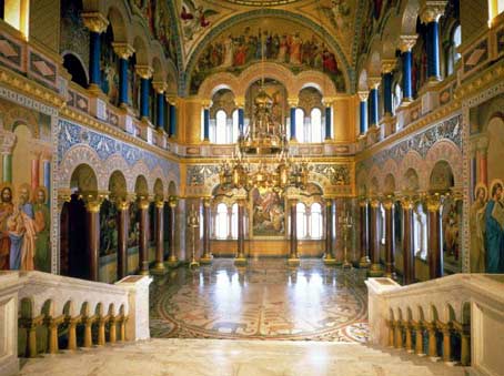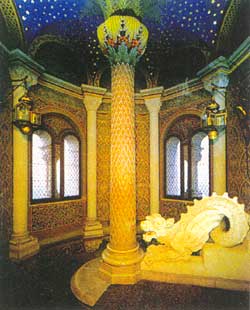 Phòng Ngai vàng, dựa theo quyết định của Ludwig về nhà thờ Hagia Sophia, do Edouard thiết kế, ban đầu được xem là Phòng Chén thánh trong Parsifal của Wagner. (Ảnh: puzzlehouse) |