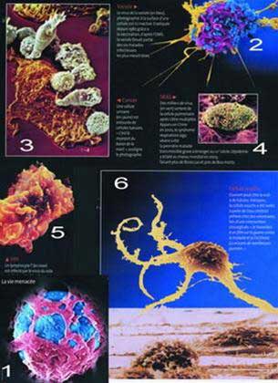 5. HIV: Bạch huyết bào T màu hồng, bị virus HIV (vàng) sinh sôi nảy nở và tấn công tiêu diệt. Năm 2005 số người sống chung với HIV trên thế giới vượt số 40 triệu. Từ lúc phát khởi năm 1980, HIV giết chết 25 triệu người.