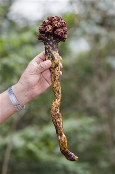 Loài cây kỳ lạ này, lần đầu tiên sẽ được đặt tên, không phải là một loài hoa đẹp. Cuống cây to, thô, màu nâu vàng và có một chùm hoa dày đặc hình nón quả thông ở bên trên.