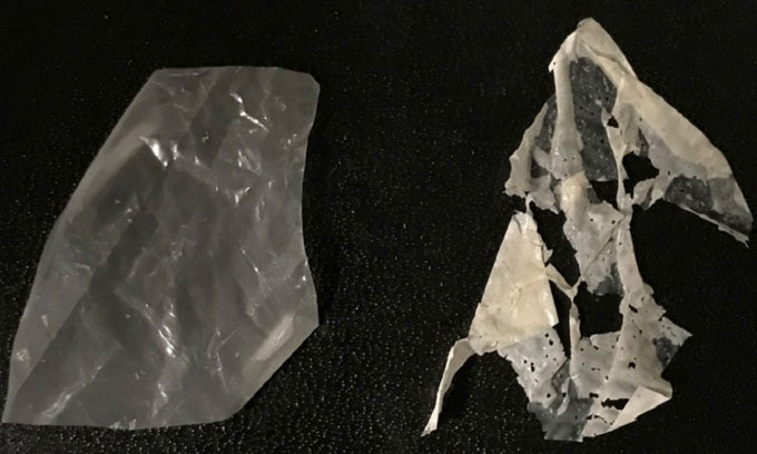 Nhựa đã biến đổi (trái) phân hủy sau 3 ngày (phải). (Ảnh: Ting Xu).