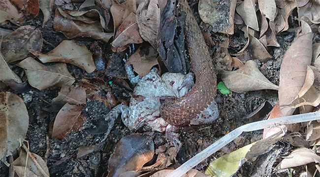 Một con rắn Oligodon formosanus đang ăn nội tạng ễnh ương trên đảo Lantau. (Ảnh: Jo Lodder).