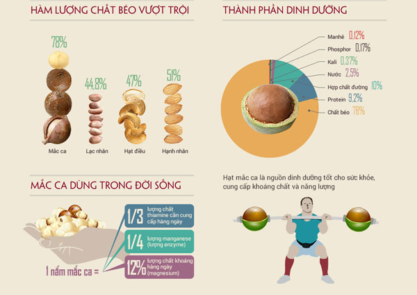 Các nhà khoa học nước ngoài đánh giá loại quả mắc ca là loại hạt giàu dinh dưỡng số 1 thế giới. Chúng là loại quả có chứa hàm lượng dinh dưỡng và năng lượng cao nhưng lại không chứa Cholesterol. Trong thành phần dinh dưỡng của quả mắc ca có đến 78% là dầu tự nhiên. Ngoài ra còn có hàm lượng chất xơ và các loại vitamin và khoáng chất quý giá.
