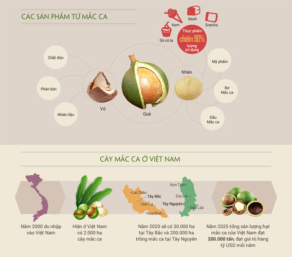 Khoảng 90% sản lượng hạt mắc ca được dùng trong ngành thực phẩm và giá trị cao của loại hạt này đang hứa hẹn sẽ trở thành một nguồn thu đáng kể cho Việt Nam.