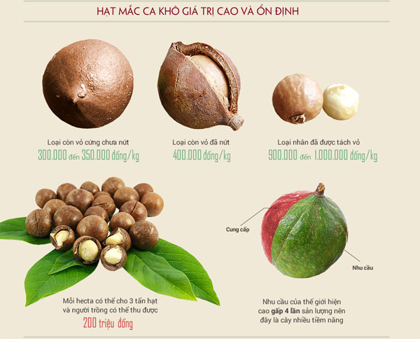 Theo các nhà làm vườn thì đây là loại cây cho kinh tế cao. Chỉ trồng một lần có thể cho thu hoạch lâu dài lên đến trên 30 năm. Do cây giàu dinh dưỡng nên giá bán của hạt mắc ca cũng khá cao mang lại nguồn thu nhập khá cho người làm vườn.