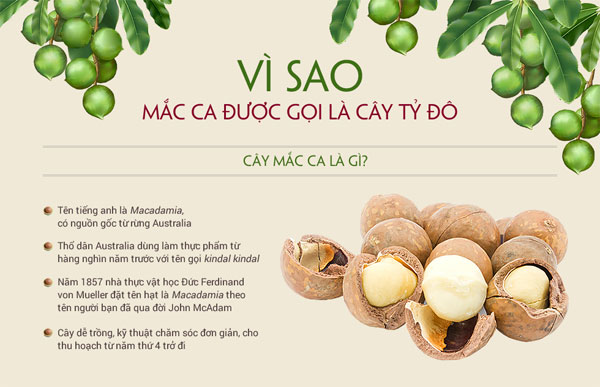 Cây mắc ca có nguồn gốc từ Úc được du nhập sang nhiều nước Châu Á trong đó có Việt Nam. Đây là loại cây thân gỗ lâu năm có chiều cao trung bình lên đến 10m. Cây mắc ca cho bộ tán rộng và bộ rễ nông. Hoa của cây mắc ca có màu trắng hoặc hơi hồng thường mọc ra từ nánh lá vào khoảng tháng 12 đến tháng 2 hàng năm.