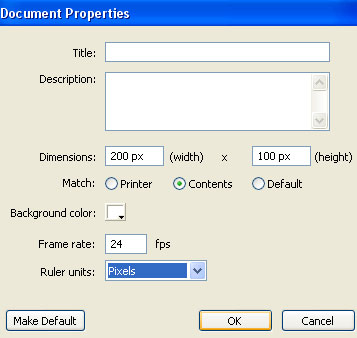 Mở Flash và tạo một file mới với kích thước 200x100px. Chọn màu nền là màu trắng và thiết lập Frame rate là 24, sau đó kích OK.