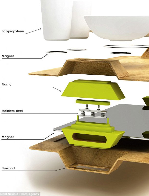 Magic Tray giữ ly tách và chén dĩa cố định nhờ các nam châm trang bị bên dưới, ngăn chúng trượt khỏi khay khi bị nghiêng. Chiếc khay làm bằng ván ép này có kích thước 55,88 x 25,4cm và để được 2 ly, 2 dĩa hoặc tô. Phần đáy của các ly và dĩa cũng được gắn thêm các vòng nam châm nhằm giúp chúng bám chặt vào khay. Khi sử dụng, người dùng chỉ cần ấn nhẹ chỗ tay cầm là hệ thống nam châm được kích hoạt.