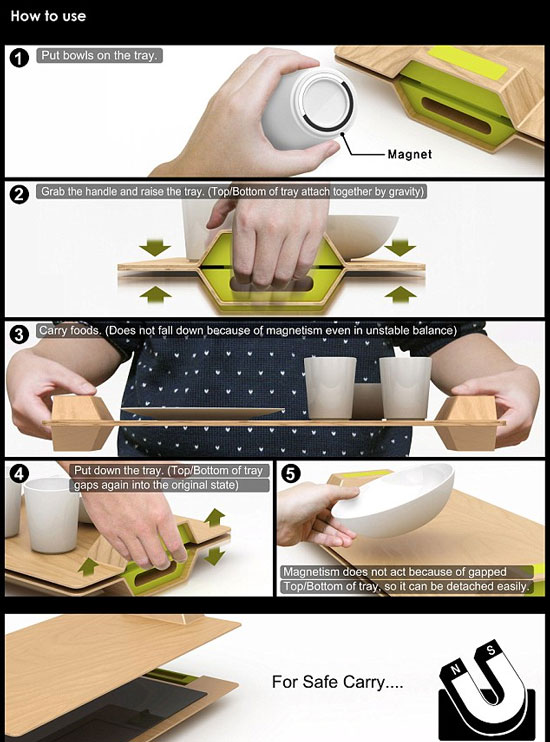 Nhà thiết kế Choi cho biết sản phẩm này ra đời sau một cuộc khảo sát đối với các nhân viên nhà hàng cho thấy họ thường xuyên lo chén dĩa trượt khỏi mâm mỗi khi bưng thức ăn cho khách và mong muốn có được giải pháp vận chuyển thực phẩm an toàn hơn.