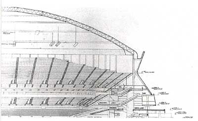 Nói theo cách đơn giản, 96 cột thép kết cấu xếp thành 4 hàng, đỡ 1 vòng chịu kéo tựa lên các gối tựa đầu (có thể xoay nhưng không thể di động trên phương ngang) 10cm. Những gối tựa này tạo cho vòng (cũng là mái) sự di chuyển linh động khoảng 8cm theo một hướng bất kỳ, để bù lại sự giãn nở hay co lại khi nhiệt độ thay đổi, đảm bảo tính nguyên vẹn của công trình. Đối với giằng tăng cứng ở cánh tường, khung có các gối đỡ chữ "K" kéo dài ra phía ngoài từ bên dưới đường kính gần 0,8km của vòng.