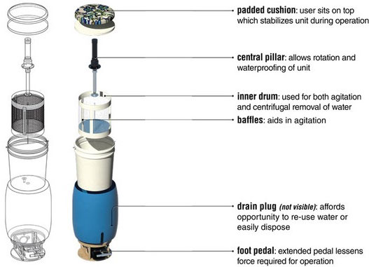 Máy giặt sử dụng sức người không phải là ý tưởng mới nhưng thách thức ở đây là làm thế nào để chế tạo ra một chiếc máy rẻ, dễ di chuyển dễ sử dụng và quan trọng là làm quần áo sạch và tương đối khô. Sau khi làm việc với một số mẫu máy rửa bát và máy trộn salad, nhóm nghiên cứu đã tạo ra một chiếc máy giặt có hình dáng trông như loại bình giữ nhiệt du lịch.
