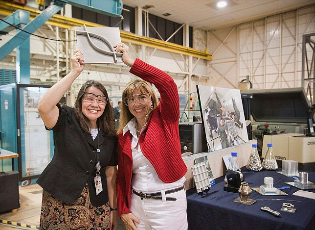 Kỹ sư Karen Taminger đang giơ một linh kiện máy được máy in "in" ra.