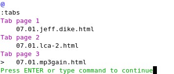 Chú ý rằng các tab vẫn ở đó, cho dù tab bar không được hiển thị. Nếu thiết lập tuỳ chọn tabline là 0, bạn có thể biết được tab nào đang được mở bằng cách dùng lệnh :tabs. Nó sẽ cung cấp tóm tắt các tab mở, như bạn có thể thấy trong hình minh hoạ.