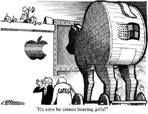 Thật ra, Apple cũng có những rắc rối không nhỏ. Trước hết, máy tính và hệ điều hành của hãng này chỉ chiếm một thị phần rất khiêm tốn trên thị trường. Hãng không cấp giấy phép sản phẩm hay áp chế chuẩn công nghệ được cho ai. Máy tính Apple tuy bền, an toàn cao nhưng lại thiếu tương thích với các nền phần mềm khác. Do đó, bắt tay cùng Microsoft có thể giúp sản phẩm Apple chạy vèo vèo trong môi trường Windows.