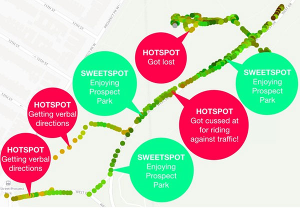 Bên cạnh đó, những điểm màu đỏ cho thấy tâm trạng bất an và lo lắng của người điều khiển, nó cho thấy những tuyến đường không an toàn. Các dữ liệu này sau đó sẽ được lưu lại và khi người đi xe đạp đi qua một tuyến đường đã được đánh dấu, đèn LED trên chiếc mũ xe chuyển màu nhằm cảnh báo cho người đi xe những đoạn đường không an toàn.