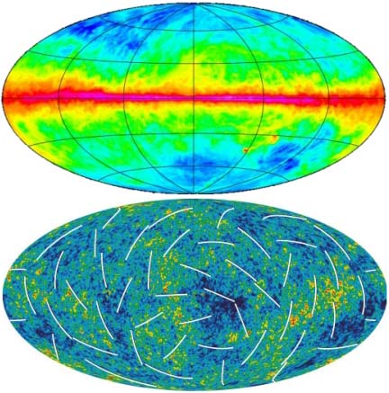 Bản đồ bức xạ sóng vô tuyến từ các nguyên tử Hydro từ dải Ngân Hà (ảnh bên trên) được Gerrit Verschuur khẳng định liên quan đến bản đồ bức xạ phông vi ba của vũ trụ ghi nhận bởi WMAP (ảnh dưới). |