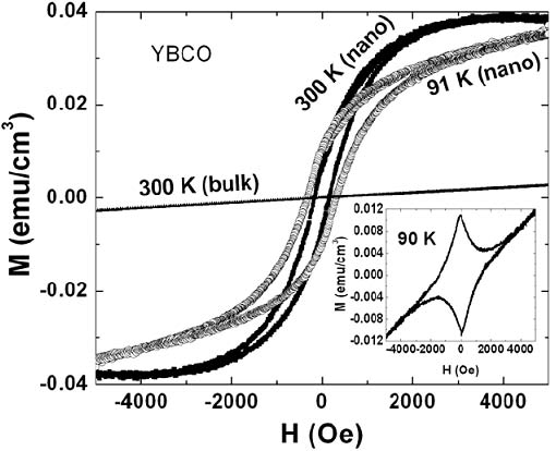 Hình 1. Đường cong từ trễ của các hạt nano YBaCuO siêu dẫn ở nhiệt độ phòng và 91 K