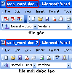 Ví dụ: file Sach_Word.doc đang mở, khi lựa chọn Window \ New Window, chương trình MS Word sẽ tự động tạo ra 1 file mới với tiêu đề là: Sach_Word.doc:2, tiêu đề file gốc sẽ được chuyển thành Sach_Word.doc:1