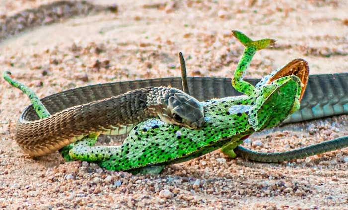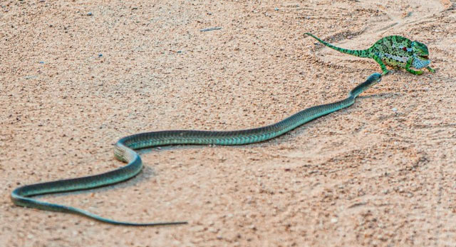 Đối thủ của con rắn là một con tắc kè hoa chủ yếu được tìm thấy ở châu Phi và Madagascar. Khoảng 50% tắc kè hoa trên thế giới là loài đặc hữu ở Madagascar. Hiện mới chỉ có 66 loài được nhận dạng. Có lẽ tắc kè hoa là loài đặc biệt nhất trong số mọi loài thằn lằn, do được "thiết kế" hoàn hảo để sống trên cây.
