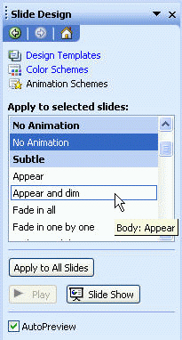 - Mở Slide Design – Animation Schemes Task Pane và chọn hoạt ảnh phù hợp mà bạn chọn.