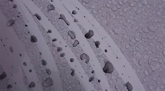 Những giọt nước mưa trông giống như sơn đen mỏng nhưng không phải là phóng xạ. Nguyên nhân của màu sắc lạ của nước mưa hiện đang được các nhà khoa học điều tra.