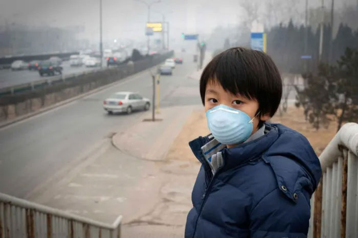 Một cậu bé đeo khẩu trang để giảm tác hại ô nhiễm không khí do ô tô gây ra ở Bắc Kinh. (Ảnh: ShutterStock).