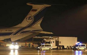 Chiếc xe tải đang chở uranium ra chiếc máy bay chở hàng Ilyushin IL-76 tại sân bay Dresden sáng sớm hôm nay. (Ảnh: Reuters) |