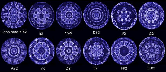 Theo đó, thiết bị CymaScope sử dụng camera độ nét cao để theo dõi ảnh hưởng của rung động đặc biệt từ một âm thanh riêng lẻ trong môi trường nước tinh khiết. Do sức căng bề mặt của nước, những giai điệu của âm thanh đặc biệt sẽ tạo ra dấu ấn độc đáo trong nước trông giống như một bông tuyết; 2 âm thanh khác nhau thể hiện bằng 2 hình ảnh không giống nhau. Nghệ sĩ Shannon Novak người New Zealand đã ghi hình ảnh các nốt nhạc piano, phóng kích cỡ của chúng lên thành 12 bức tranh âm nhạc. Ông nói với báo Daily Mail: "Tôi luôn bị mê hoặc với việc mô tả âm thanh thông qua màu sắc và góc độ hình học”. Với Novak thì công nghệ cymatic là một trong những phương pháp đại diện độc đáo; là cách nối kết để hiểu mối liên hệ giữa âm thanh, màu sắc và định dạng hình học.