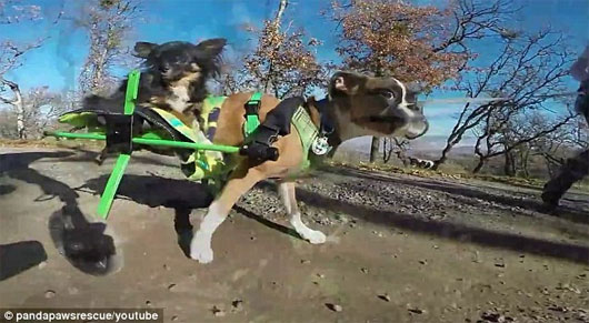 Con chó chỉ còn hai chân trước này đã vượt qua khuyết tật của mình và tự mình đi lại với sự giúp đỡ của chiếc xe lăn được thiết kế đặc biệt.