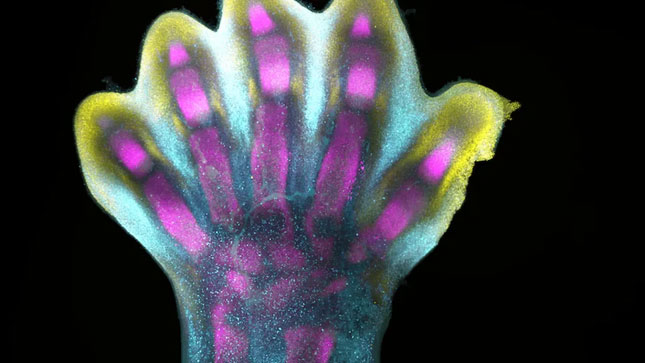 Một bàn chân người đang phát triển, trên đó có các chấm màu khác nhau là các gene tạo nên xương, cơ và sụn
