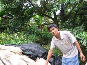 Vì vậy đến mùa mưa năm sau, anh Lợi thử tìm cách tạo môi trường khan nước cho rễ cây sầu riêng bằng cách dùng tấm nilông che quanh gốc cây. Anh kể: “Bước đầu tôi chỉ dám thử nghiệm với duy nhất một cây. May mắn là cây được che gốc cho trái ngon hẳn và gần như không có trái sượng”.