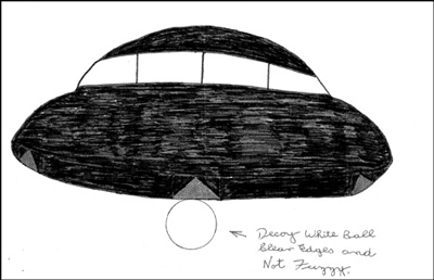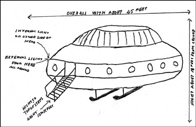 Đây là hình vẽ của một người đã quan sát thấy UFO gửi đến cho Bộ quốc phòng Anh. Theo tác giả, UFO này dùng các phương pháp tránh bị phát hiện và người trên UFO là "những thiên thần" . |