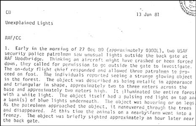 Đây là trang tài liệu viết về vụ RAF Woodbridge ở Suffolk vào tháng 12/1980. Đây là vụ được xem là vụ "Roswell của Anh". |