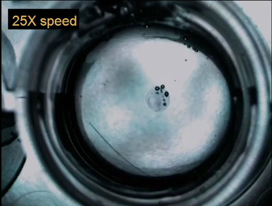 Các robot lỏng đường kính 2 mm chìm trong dung dịch và vận chuyển hóa chất qua lại. (Video: Ganhua Xie/Tom Russell/Berkeley Lab)