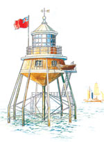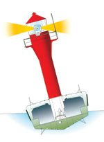 Đối với loại phương tiện là tàu hải đăng, vấn đề quan trọng là làm sao giữ cho nguồn ánh sáng phát ra luôn ở một vị trí cố định khi chiếc tàu lắc lư lên xuống theo con nước. Năm 1915, Dalen, một kỹ sư Thuỵ Điển, đã khắc phục được tình trạng này khi nghiên cứu chế tạo ra một loại “hải đăng dao động”. Hệ thống thấu kính được đặt trên một giá đỡ dao động cân bằng. Điều này sẽ giúp nguồn sáng luôn giữ được một vị trí ổn định trên thân tàu. | Khi vật liệu sắt được sử dụng phổ biến trong xây dựng với chi phí lắp đặt thấp, tại Anh vào năm 1840, người ta đã xây dựng một ngọn hải đăng với 9 cột sắt chống đỡ, ngay trên một dải cát ngầm tại cửa sông Thames. Đến thập niên 1850, đã có thêm hơn 10 hải đăng loại này được dựng lên tại Anh và Mỹ. | |