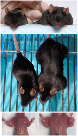 Sự so sánh của cơ thể và kích cỡ cơ bắp giữa những con chuột bình thường (bên trái) và những con chuột đột biến to gấp đôi thiếu protein myostatin và sự sản xuất thừa protein follistatin (bên phải) - (Ảnh do Johns Hopkins Medical Institutions cung cấp) |