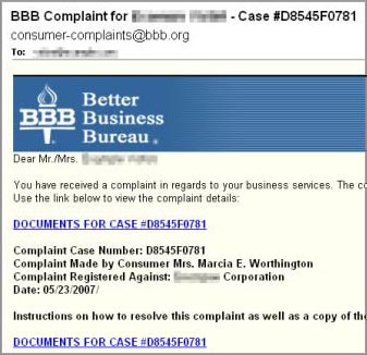 E-mail giả danh ngân hàng, trang đấu giá trực tuyến hay tổ chức có uy tín nào đó... để yêu cầu người sử dụng bấm vào đường link hoặc tải tài liệu đính kèm chứa mã độc. Trong ảnh là một thông điệp giả mạo tổ chức BBB (Ảnh: SecureWorks):