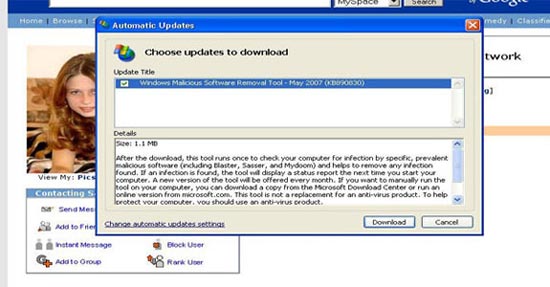 Thông báo giả Automatic Updates, được phát hiện trên một hồ sơ MySpace, khẳng định hệ thống của người dùng bị nhiễm virus và yêu cầu cài công cụ gỡ bỏ phần mềm nguy hiểm (Ảnh: FaceTime Security Labs):
