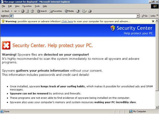 Bước tiếp theo của quá trình tấn công bằng Automatic Updates này là gây cho người dùng nỗi hoang mang rằng hệ thống của mình đã bị nhiễm độc. Thông qua đó đưa ra thông báo hỗ trợ để người dùng cả tin có thể kích vào (Ảnh: FaceTime Security Labs):